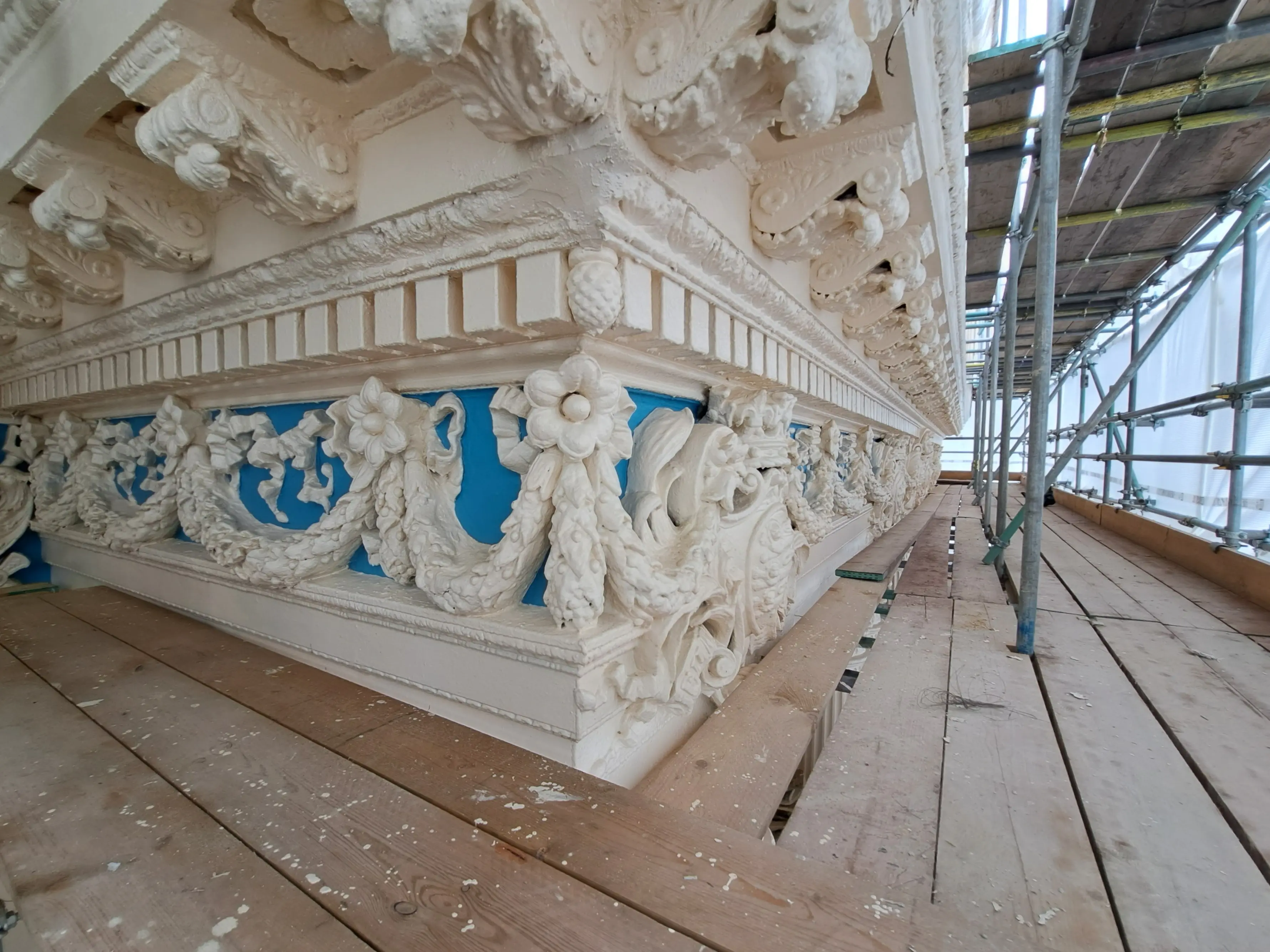 In addition to routine re-painting, a complete audit of the stucco was undertaken; long un-identified areas of water ingress were diagnosed and remedied; and supplementary rainwater disposal was introduced, ensuring the longevity of both internal and external finishes. The flourish was reinstating a classical Della Robbia blue to the background of the great frieze.